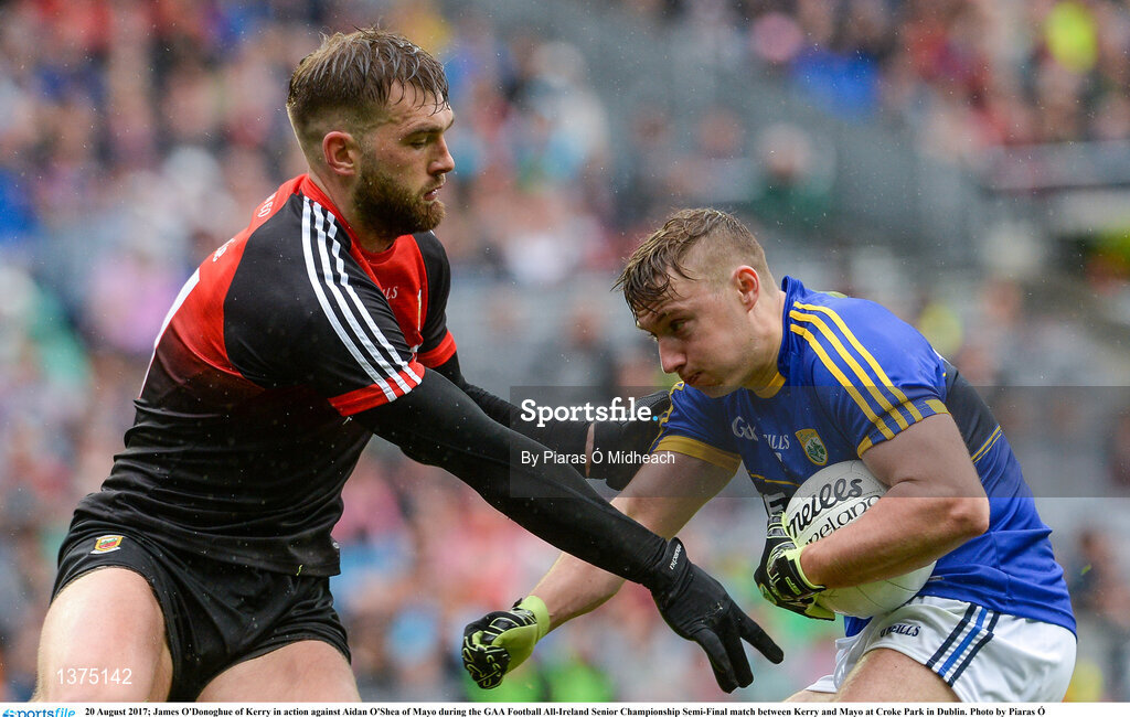 20 August 2017; James O'Donoghue of Kerry in action against Aidan O'Shea of Mayo during the GAA Football All-Ireland Senior Championship Semi-Final match between Kerry and Mayo at Croke Park in Dublin. Photo by Piaras Ó Mídheach/Sportsfile