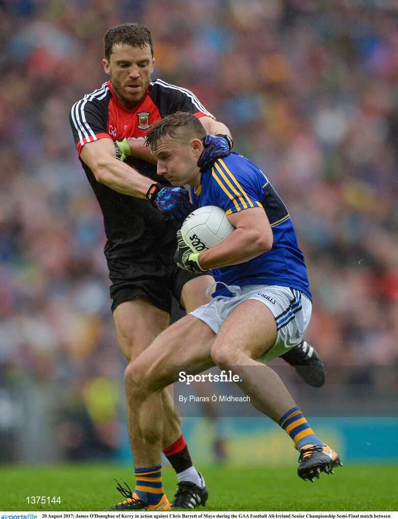 20 August 2017; James O'Donoghue of Kerry in action against Chris Barrett of Mayo during the GAA Football All-Ireland Senior Championship Semi-Final match between Kerry and Mayo at Croke Park in Dublin. Photo by Piaras Ó Mídheach/Sportsfile