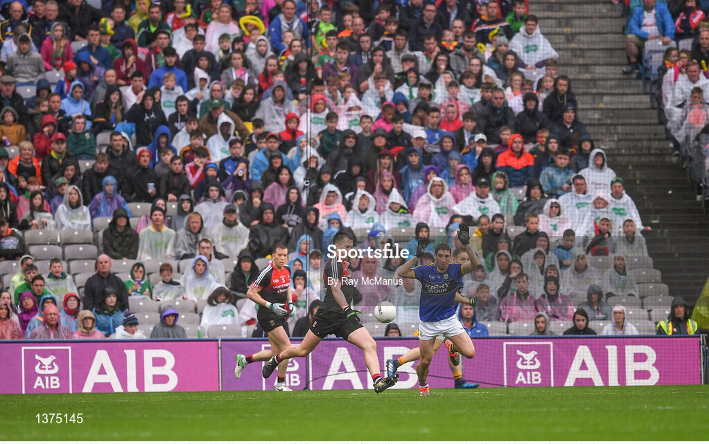 20 August 2017; Cillian O'Connor of Mayo scores a point under pressure from Killan Young of Kerry in the 61st minute of the GAA Football All-Ireland Senior Championship Semi-Final match between Kerry and Mayo at Croke Park in Dublin. Photo by Ray McManus/Sportsfile