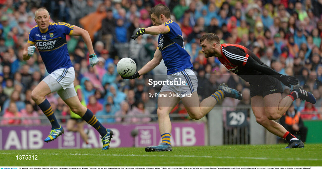 20 August 2017; Stephen O'Brien of Kerry, supported by team-mate Kieran Donaghy, on his way to scoring his side's first goal, despite the efforts of Aidan O'Shea of Mayo during the GAA Football All-Ireland Senior Championship Semi-Final match between Kerry and Mayo at Croke Park in Dublin. Photo by Piaras Ó Mídheach/Sportsfile