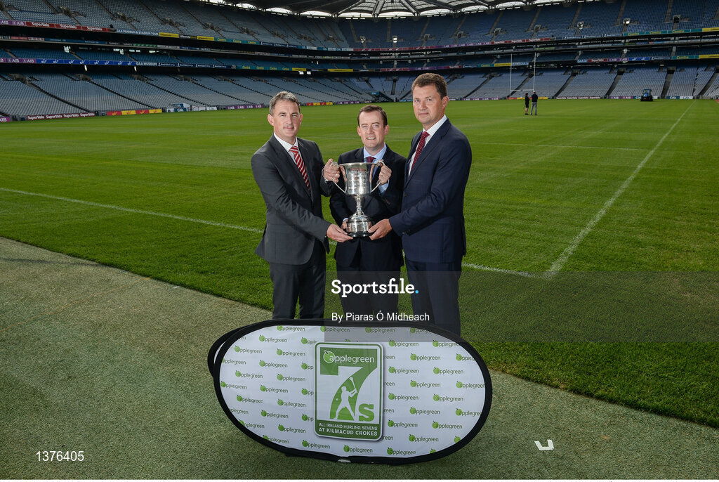 23 August 2017; In attendance at the Applegreen All-Ireland Hurling 7s launch, are, from left, Mark Lohan, Chairman of the Applegreen All Ireland Hurling 7s Committee, Peter Walsh, Kilmacud Crokes Hurling Chairman, and Conor Lucey, Applegreen, at Croke Park in Dublin. Photo by Piaras Ó Mídheach/Sportsfile