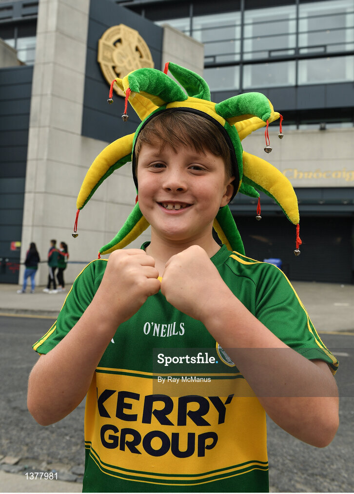 26 August 2017; Kerry supporter Jayden Foley, from Farranfore, outside Croke Park before the GAA Football All-Ireland Senior Championship Semi-Final Replay match between Kerry and Mayo at Croke Park in Dublin. Photo by Ray McManus/Sportsfile