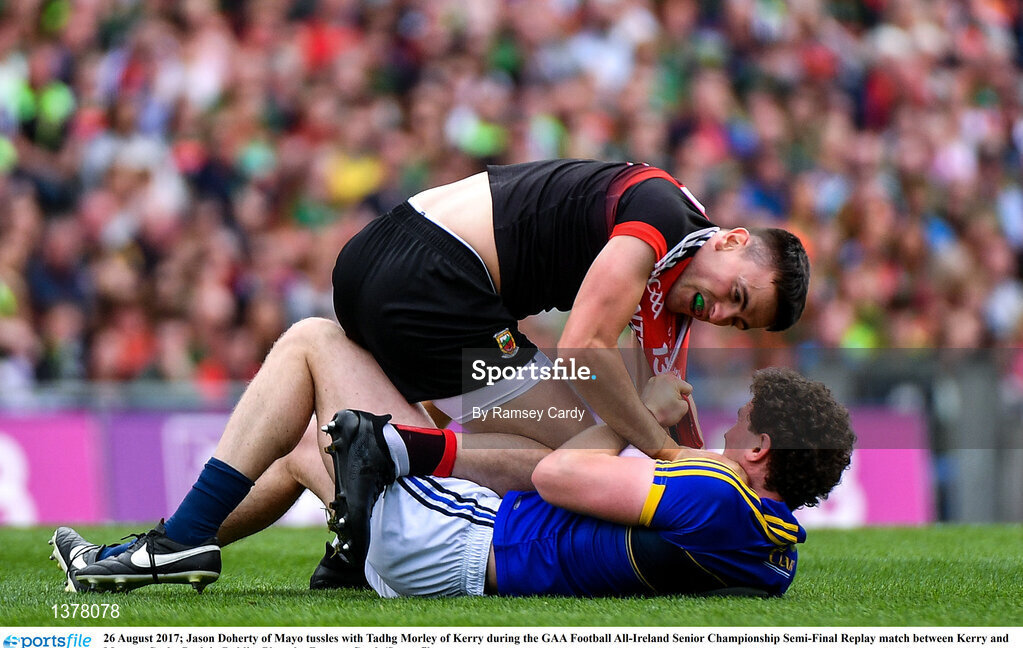 26 August 2017; Jason Doherty of Mayo tussles with Tadhg Morley of Kerry during the GAA Football All-Ireland Senior Championship Semi-Final Replay match between Kerry and Mayo at Croke Park in Dublin. Photo by Ramsey Cardy/Sportsfile