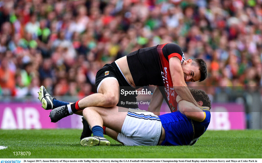26 August 2017; Jason Doherty of Mayo tussles with Tadhg Morley of Kerry during the GAA Football All-Ireland Senior Championship Semi-Final Replay match between Kerry and Mayo at Croke Park in Dublin. Photo by Ramsey Cardy/Sportsfile