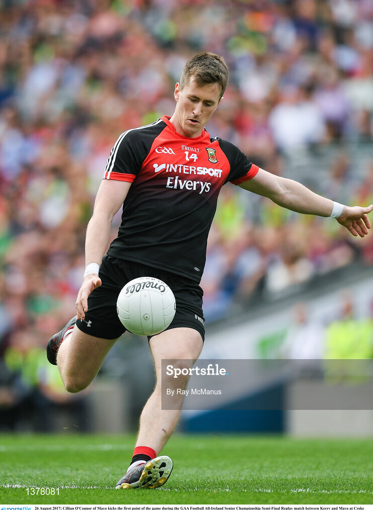26 August 2017; Cillian O'Connor of Mayo kicks the first point of the game during the GAA Football All-Ireland Senior Championship Semi-Final Replay match between Kerry and Mayo at Croke Park in Dublin. Photo by Ray McManus/Sportsfile