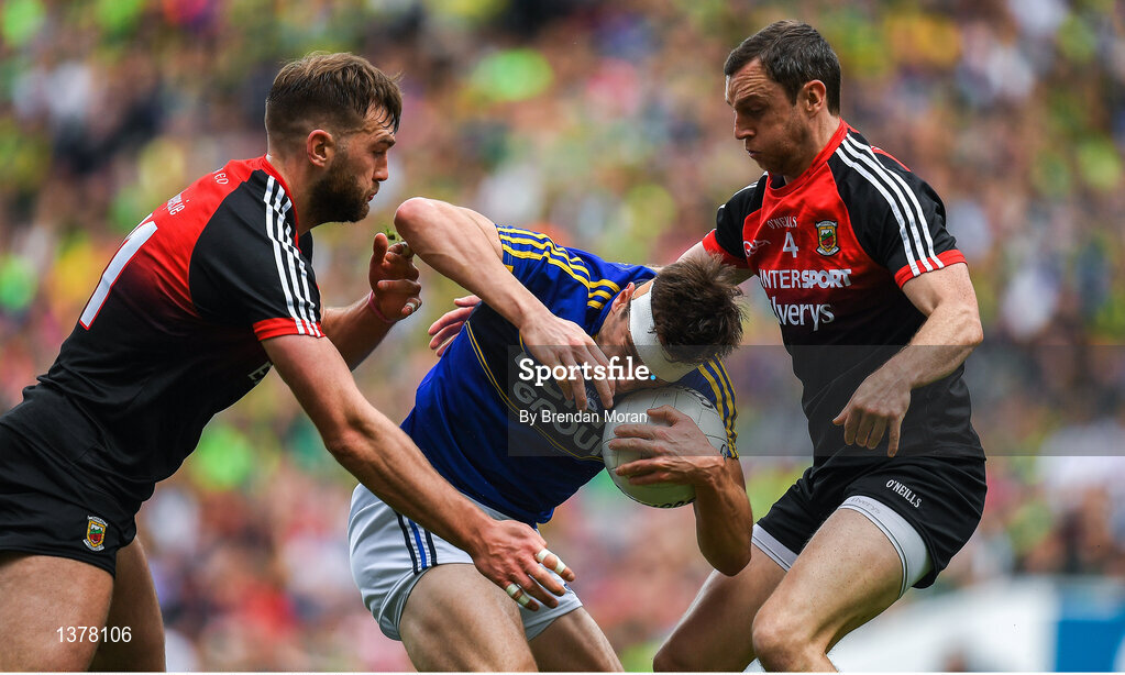 26 August 2017; David Moran of Kerry in action against Aidan O'Shea, left, and Keith Higgins of Mayo during the GAA Football All-Ireland Senior Championship Semi-Final Replay match between Kerry and Mayo at Croke Park in Dublin. Photo by Brendan Moran/Sportsfile