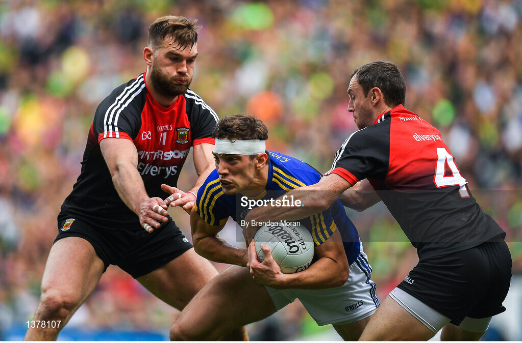 26 August 2017; David Moran of Kerry in action against Aidan O'Shea, left, and Keith Higgins of Mayo during the GAA Football All-Ireland Senior Championship Semi-Final Replay match between Kerry and Mayo at Croke Park in Dublin. Photo by Brendan Moran/Sportsfile