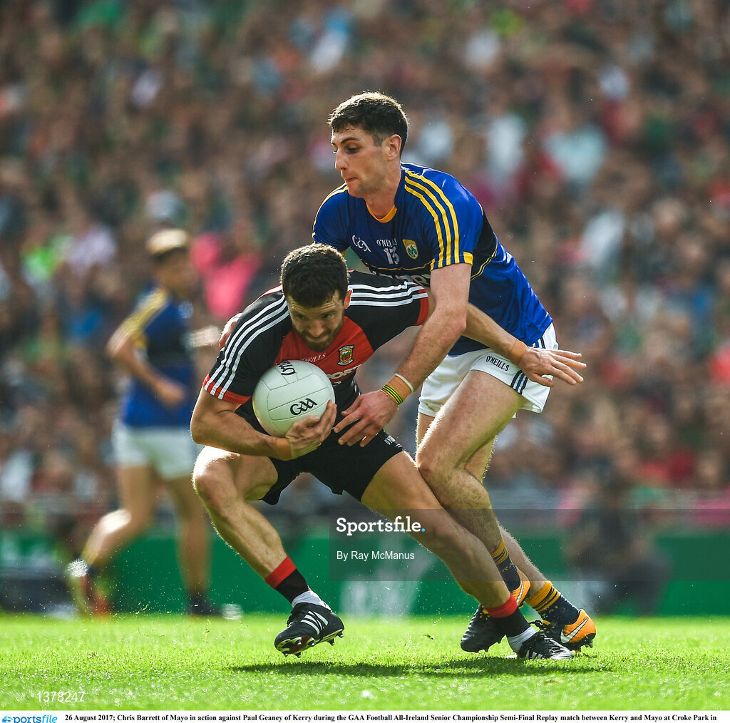 26 August 2017; Chris Barrett of Mayo in action against Paul Geaney of Kerry during the GAA Football All-Ireland Senior Championship Semi-Final Replay match between Kerry and Mayo at Croke Park in Dublin. Photo by Ray McManus/Sportsfile