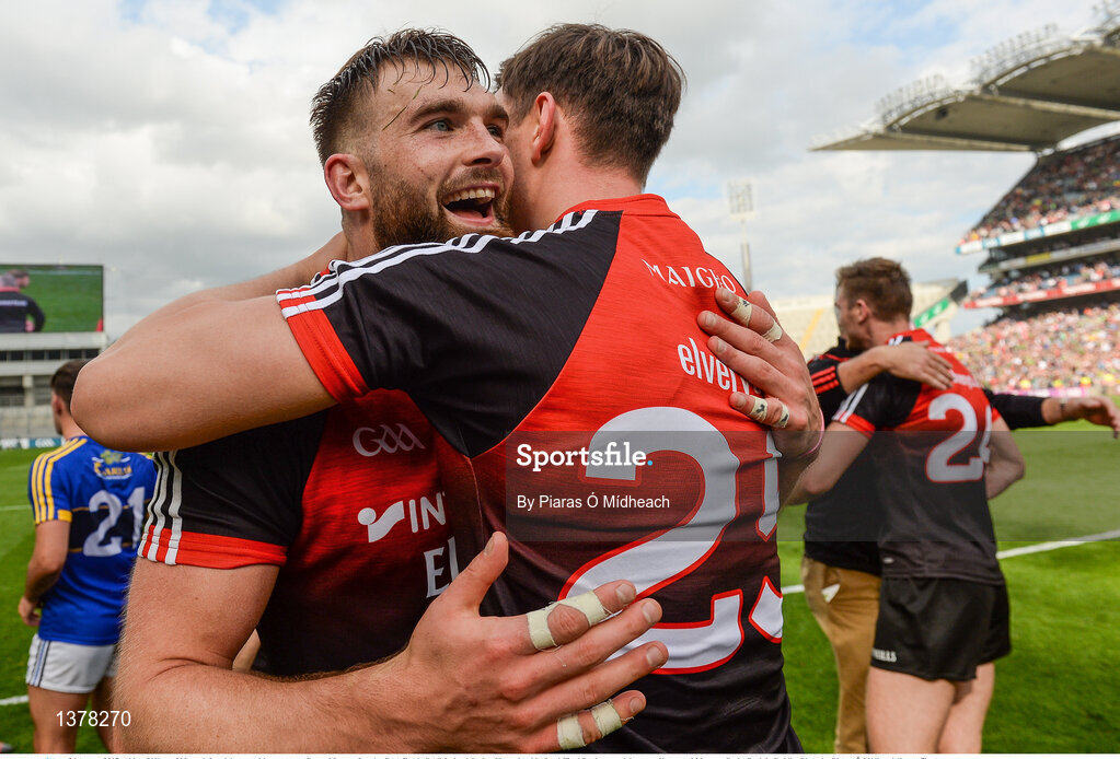 26 August 2017; Aidan O'Shea of Mayo, left, celebrates with team-mate Barry Moran after the GAA Football All-Ireland Senior Championship Semi-Final Replay match between Kerry and Mayo at Croke Park in Dublin. Photo by Piaras Ó Mídheach/Sportsfile
