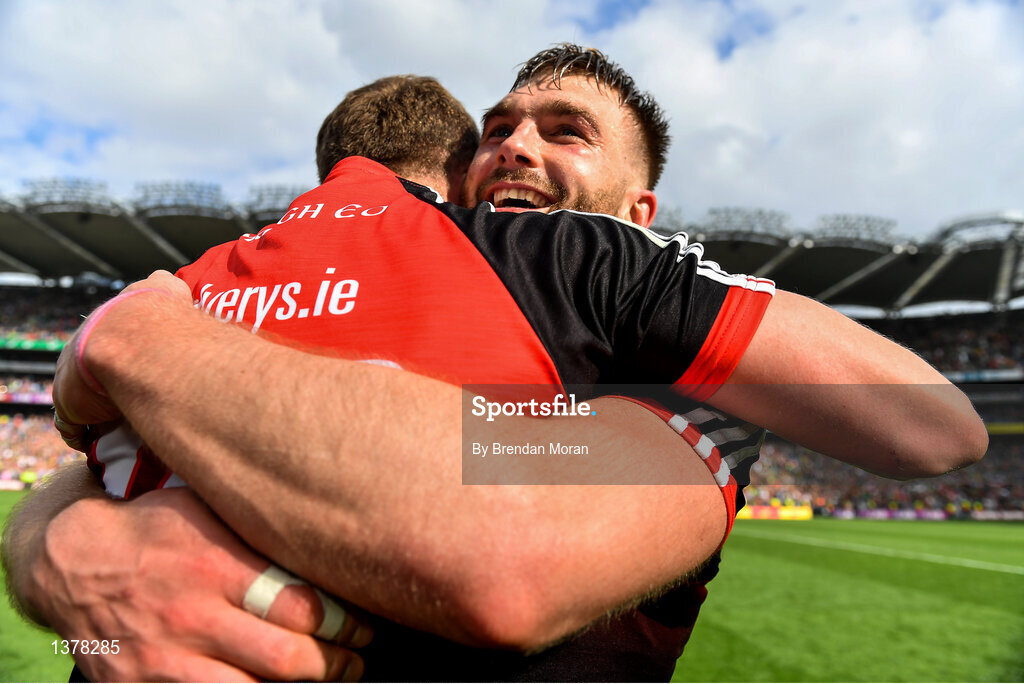 26 August 2017; Aidan O'Shea, right, and Andy Moran of Mayo celebrate after the GAA Football All-Ireland Senior Championship Semi-Final Replay match between Kerry and Mayo at Croke Park in Dublin. Photo by Brendan Moran/Sportsfile