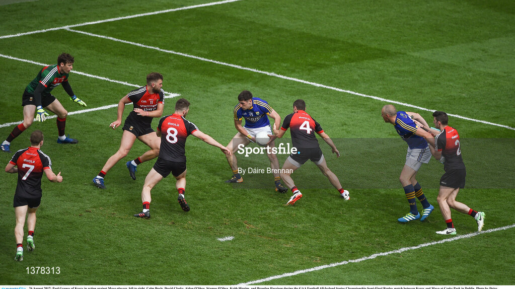 26 August 2017; Paul Geaney of Kerry in action against Mayo players, left to right, Colm Boyle, David Clarke, Aidan O'Shea, Séamus O'Shea, Keith Higgins, and Brendan Harrison during the GAA Football All-Ireland Senior Championship Semi-Final Replay match between Kerry and Mayo at Croke Park in Dublin. Photo by Daire Brennan/Sportsfile