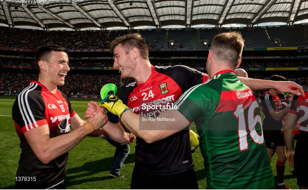 26 August 2017; Jason Doherty, Conor O'Shea and Rob Hennelly of Mayo celebrate after the GAA Football All-Ireland Senior Championship Semi-Final Replay match between Kerry and Mayo at Croke Park in Dublin. Photo by Ray McManus/Sportsfile