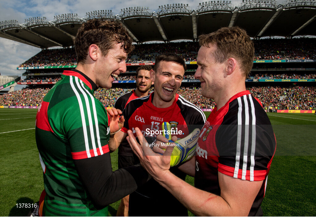 26 August 2017; David Clarke, Jason Doherty and Andy Moran of Mayo celebrate after the GAA Football All-Ireland Senior Championship Semi-Final Replay match between Kerry and Mayo at Croke Park in Dublin. Photo by Ray McManus/Sportsfile