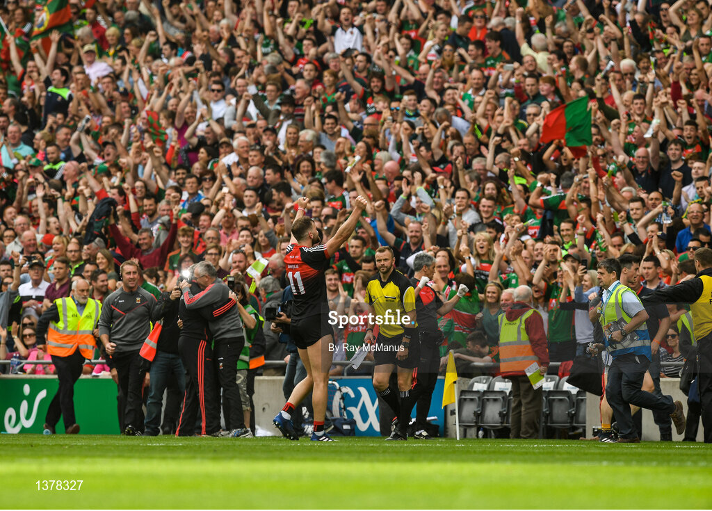 26 August 2017; Aidan O'Shea of Mayo, the Mayo management, left, and Mayo supporters in the Hogan Stand, celebrate at the final whistle in the GAA Football All-Ireland Senior Championship Semi-Final Replay match between Kerry and Mayo at Croke Park in Dublin. Photo by Ray McManus/Sportsfile