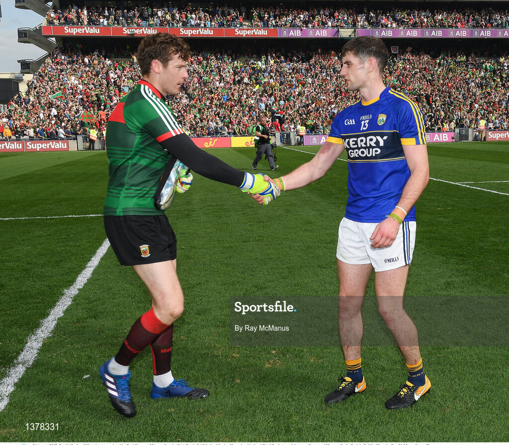26 August 2017; David Clarke of Mayo is congratulated by Paul Geaney of Kerry after the GAA Football All-Ireland Senior Championship Semi-Final Replay match between Kerry and Mayo at Croke Park in Dublin. Photo by Ray McManus/Sportsfile