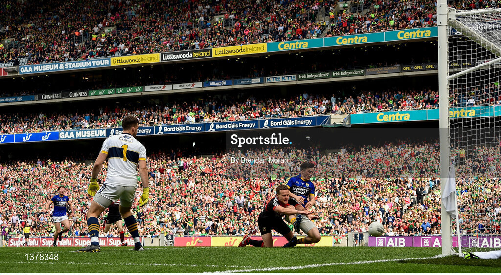 26 August 2017; Andy Moran of Mayo, centre, scores his side's second goal during the GAA Football All-Ireland Senior Championship Semi-Final Replay match between Kerry and Mayo at Croke Park in Dublin. Photo by Brendan Moran/Sportsfile