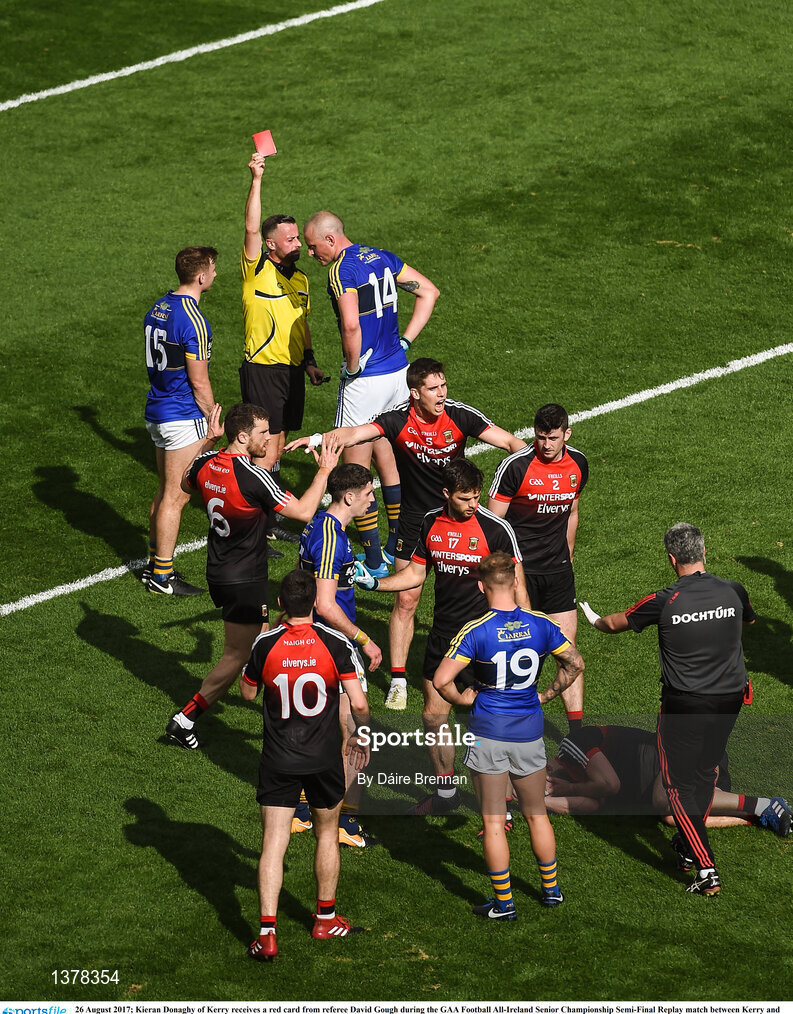 26 August 2017; Kieran Donaghy of Kerry receives a red card from referee David Gough during the GAA Football All-Ireland Senior Championship Semi-Final Replay match between Kerry and Mayo at Croke Park in Dublin. Photo by Daire Brennan/Sportsfile