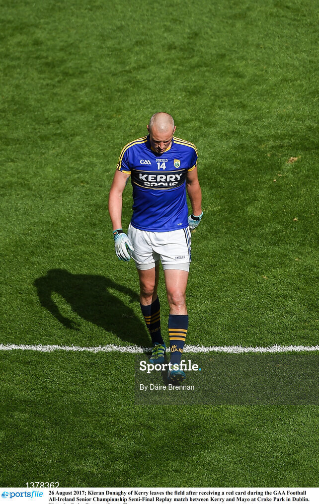 26 August 2017; Kieran Donaghy of Kerry leaves the field after receiving a red card during the GAA Football All-Ireland Senior Championship Semi-Final Replay match between Kerry and Mayo at Croke Park in Dublin. Photo by Daire Brennan/Sportsfile