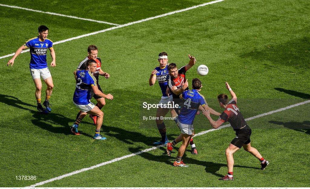 26 August 2017; Séamus O'Shea of Mayo in action against David Moran, left, and Shane Enright of Kerry during the GAA Football All-Ireland Senior Championship Semi-Final Replay match between Kerry and Mayo at Croke Park in Dublin. Photo by Daire Brennan/Sportsfile