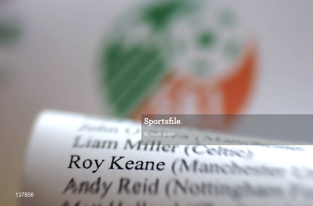 20 April 2004; A detailed view of the squad list showing the name of Roy Keane during a Republic of Ireland squad announcement at Jury's Hotel on Parnell Street, Dublin. Photo by David Maher/Sportsfile