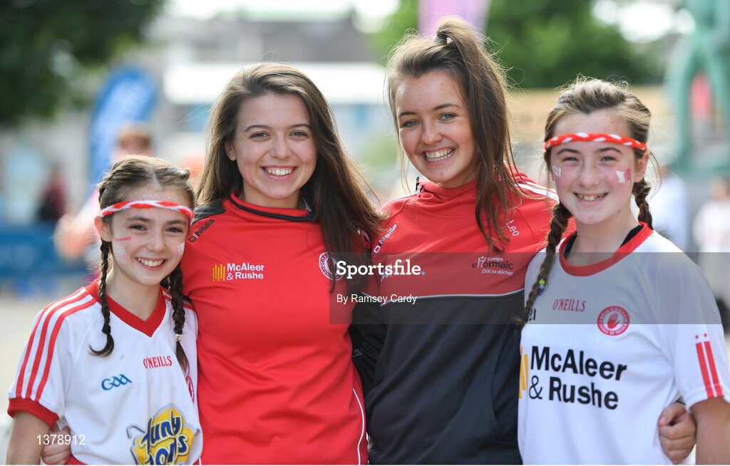 27 August 2017; Tyrone supporters, from left, Ellen McCann, Emma Campbell, Michaela Mimnagh and Holly Darcy, from Beragh ahead of the GAA Football All-Ireland Senior Championship Semi-Final match between Dublin and Tyrone at Croke Park in Dublin. Berra Photo by Ramsey Cardy/Sportsfile