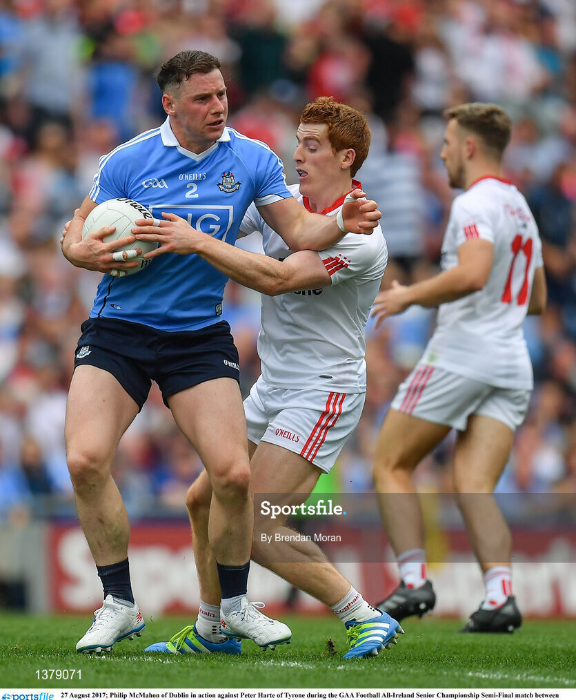 27 August 2017; Philip McMahon of Dublin in action against Peter Harte of Tyrone during the GAA Football All-Ireland Senior Championship Semi-Final match between Dublin and Tyrone at Croke Park in Dublin. Photo by Brendan Moran/Sportsfile