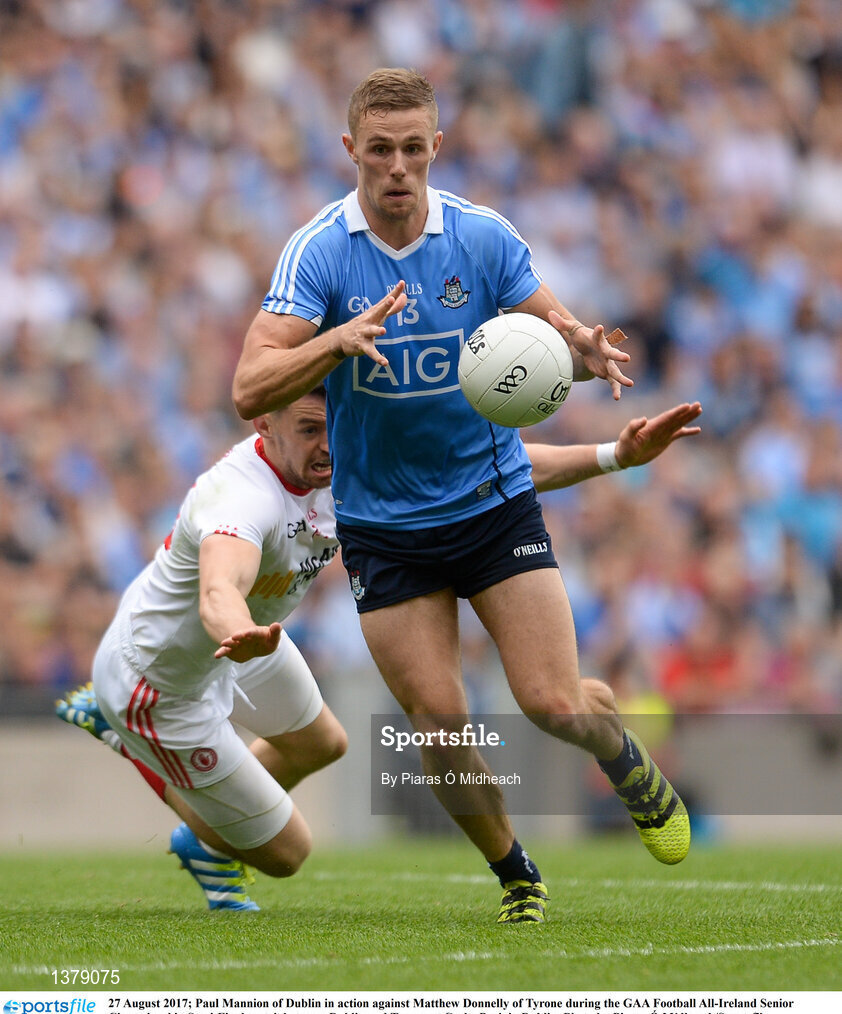 27 August 2017; Paul Mannion of Dublin in action against Matthew Donnelly of Tyrone during the GAA Football All-Ireland Senior Championship Semi-Final match between Dublin and Tyrone at Croke Park in Dublin. Photo by Piaras Ó Mídheach/Sportsfile
