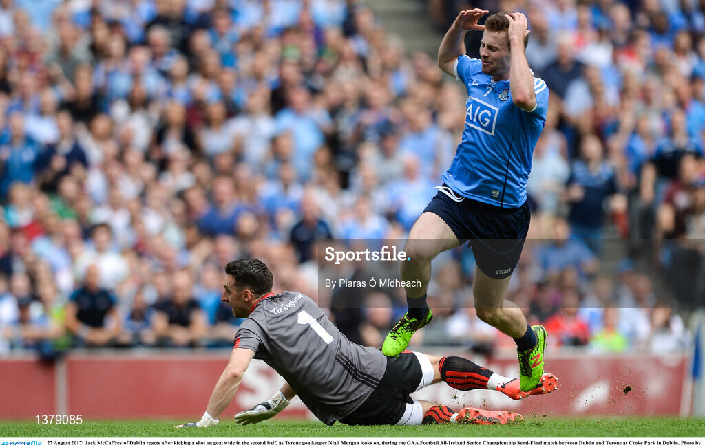27 August 2017; Jack McCaffrey of Dublin reacts after kicking a shot on goal wide in the second half, as Tyrone goalkeeper Niall Morgan looks on, during the GAA Football All-Ireland Senior Championship Semi-Final match between Dublin and Tyrone at Croke Park in Dublin. Photo by Piaras Ó Mídheach/Sportsfile