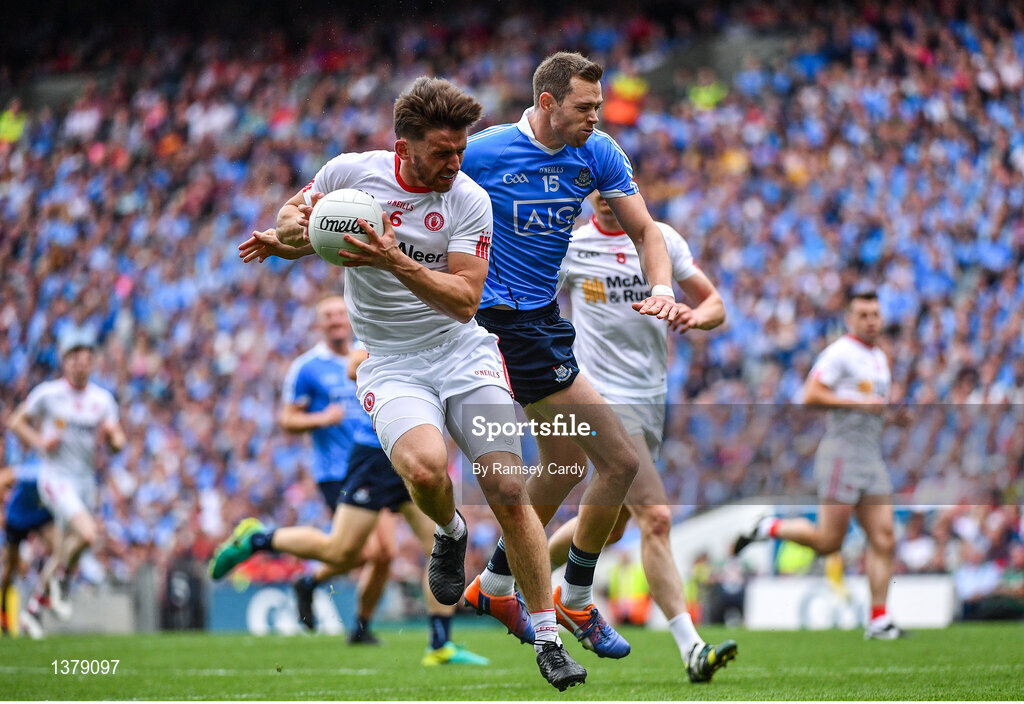27 August 2017; Pádraig Hampsey of Tyrone is tackled by Dean Rock of Dublin during the GAA Football All-Ireland Senior Championship Semi-Final match between Dublin and Tyrone at Croke Park in Dublin. Photo by Ramsey Cardy/Sportsfile