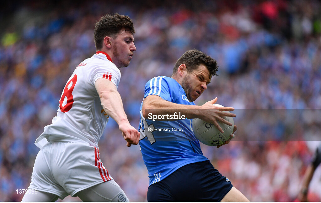 27 August 2017; Kevin McManamon of Dublin in action against Rory Brennan of Tyrone during the GAA Football All-Ireland Senior Championship Semi-Final match between Dublin and Tyrone at Croke Park in Dublin. Photo by Ramsey Cardy/Sportsfile