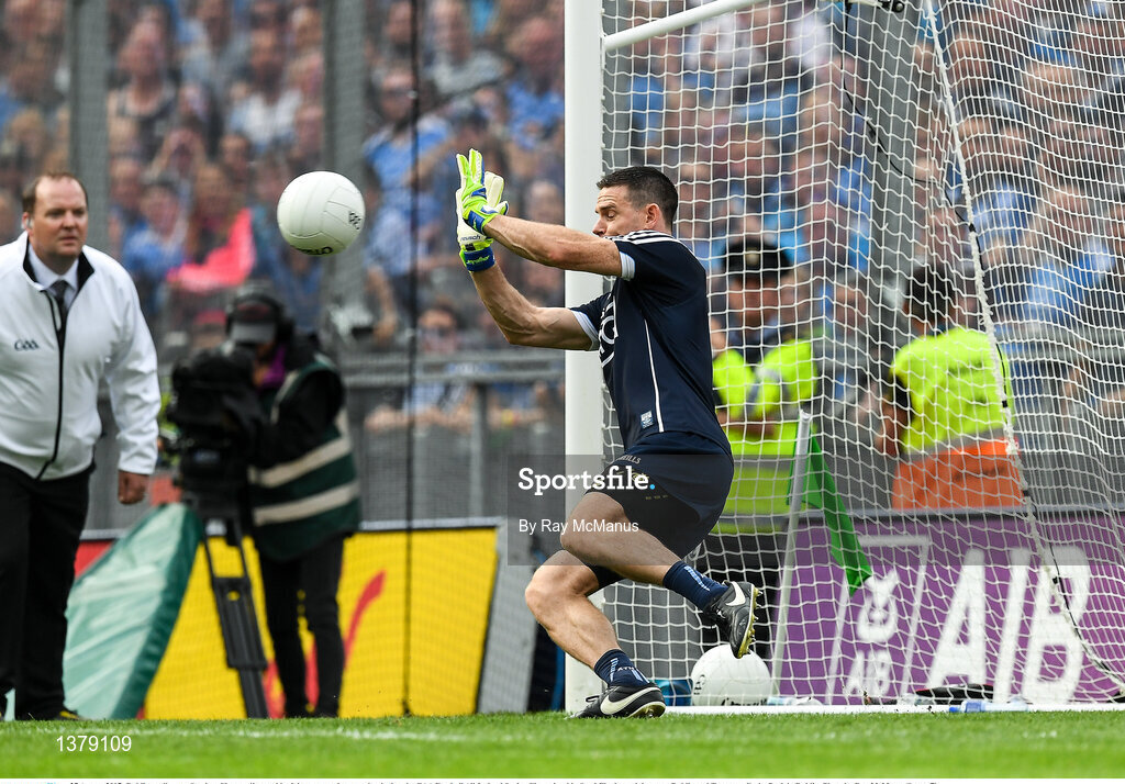27 August 2017; Dublin goalkeeper Stephen Cluxton dives to his right to save a late penalty during the GAA Football All-Ireland Senior Championship Semi-Final match between Dublin and Tyrone at Croke Park in Dublin. Photo by Ray McManus/Sportsfile