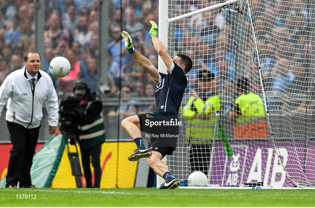 27 August 2017; Dublin goalkeeper Stephen Cluxton dives to his right to save a late penalty during the GAA Football All-Ireland Senior Championship Semi-Final match between Dublin and Tyrone at Croke Park in Dublin. Photo by Ray McManus/Sportsfile