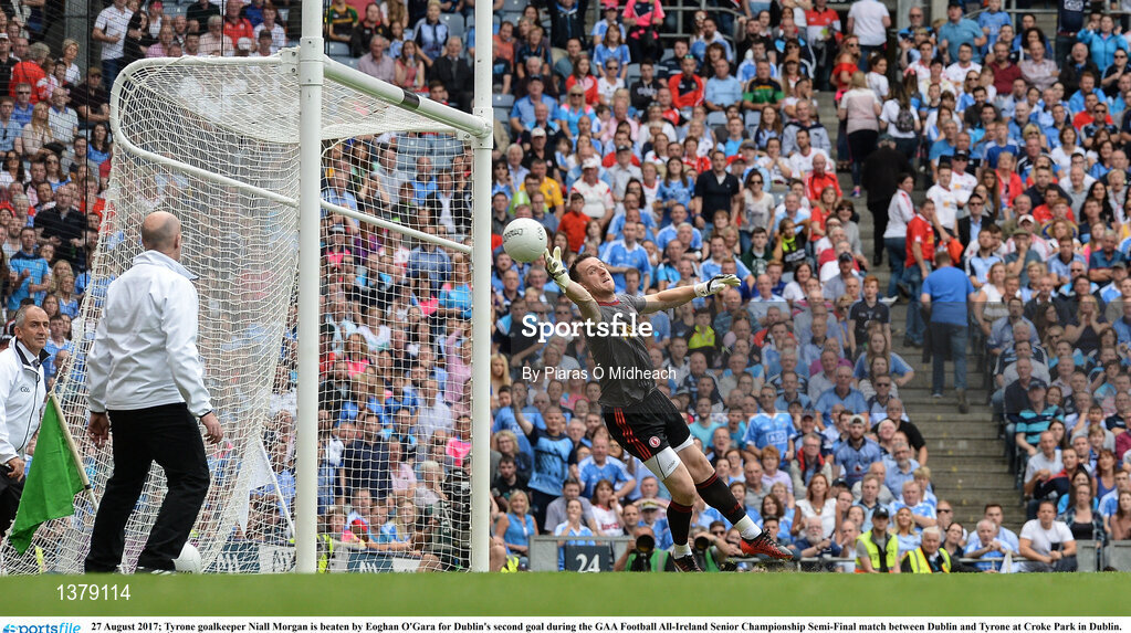 27 August 2017; Tyrone goalkeeper Niall Morgan is beaten by Eoghan O'Gara for Dublin's second goal during the GAA Football All-Ireland Senior Championship Semi-Final match between Dublin and Tyrone at Croke Park in Dublin. Photo by Piaras Ó Mídheach/Sportsfile