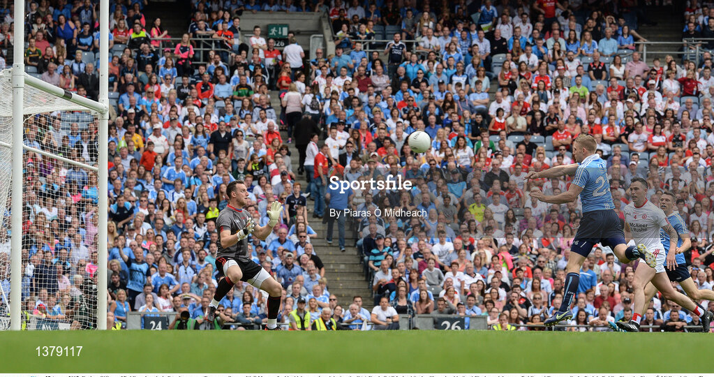 27 August 2017; Eoghan O'Gara of Dublin palms the ball to the net past Tyrone goalkeeper Niall Morgan for his side's second goal during the GAA Football All-Ireland Senior Championship Semi-Final match between Dublin and Tyrone at Croke Park in Dublin. Photo by Piaras Ó Mídheach/Sportsfile