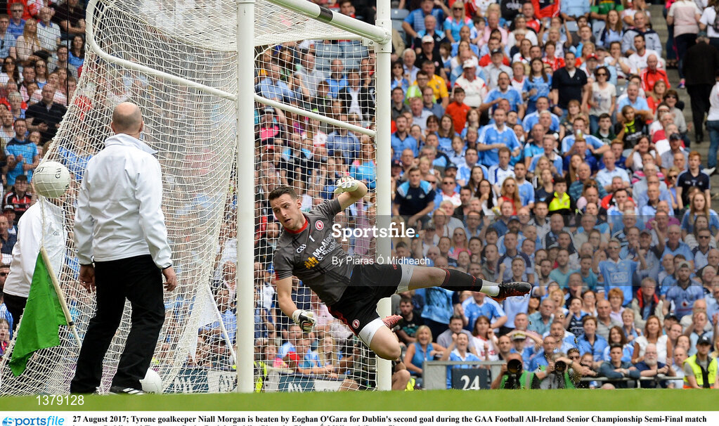 27 August 2017; Tyrone goalkeeper Niall Morgan is beaten by Eoghan O'Gara for Dublin's second goal during the GAA Football All-Ireland Senior Championship Semi-Final match between Dublin and Tyrone at Croke Park in Dublin. Photo by Piaras Ó Mídheach/Sportsfile