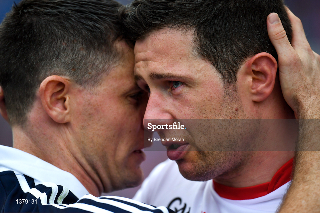 27 August 2017; Seán Cavanagh, right, of Tyrone is consoled by Dublin goalkeeper Stephen Cluxton after the GAA Football All-Ireland Senior Championship Semi-Final match between Dublin and Tyrone at Croke Park in Dublin. Photo by Brendan Moran/Sportsfile