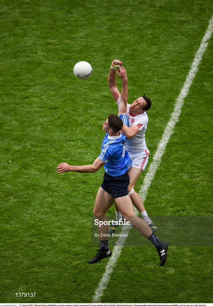 27 August 2017; Brian Fenton of Dublin in action against Colm Cavanagh of Tyrone during the GAA Football All-Ireland Senior Championship Semi-Final match between Dublin and Tyrone at Croke Park in Dublin. Photo by Daire Brennan/Sportsfile