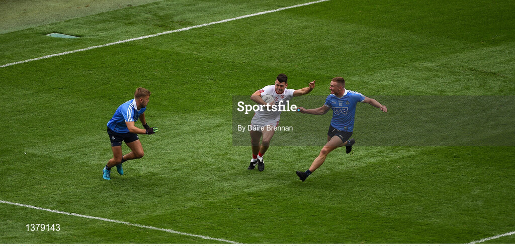27 August 2017; Darren McCurry of Tyrone in action against Jonny Cooper, left, and Ciarán Kilkenny of Dublin during the GAA Football All-Ireland Senior Championship Semi-Final match between Dublin and Tyrone at Croke Park in Dublin. Photo by Daire Brennan/Sportsfile