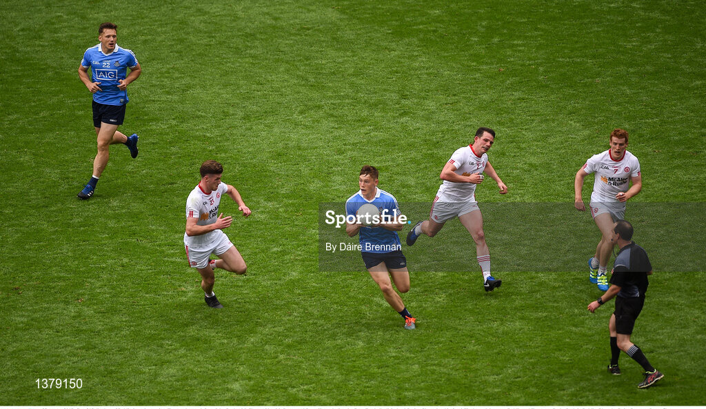 27 August 2017; Con O'Callaghan of Dublin in action against Tyrone players, left to right, Declan McClure, Aidan McCrory, and Peter Harte during the GAA Football All-Ireland Senior Championship Semi-Final match between Dublin and Tyrone at Croke Park in Dublin. Photo by Daire Brennan/Sportsfile