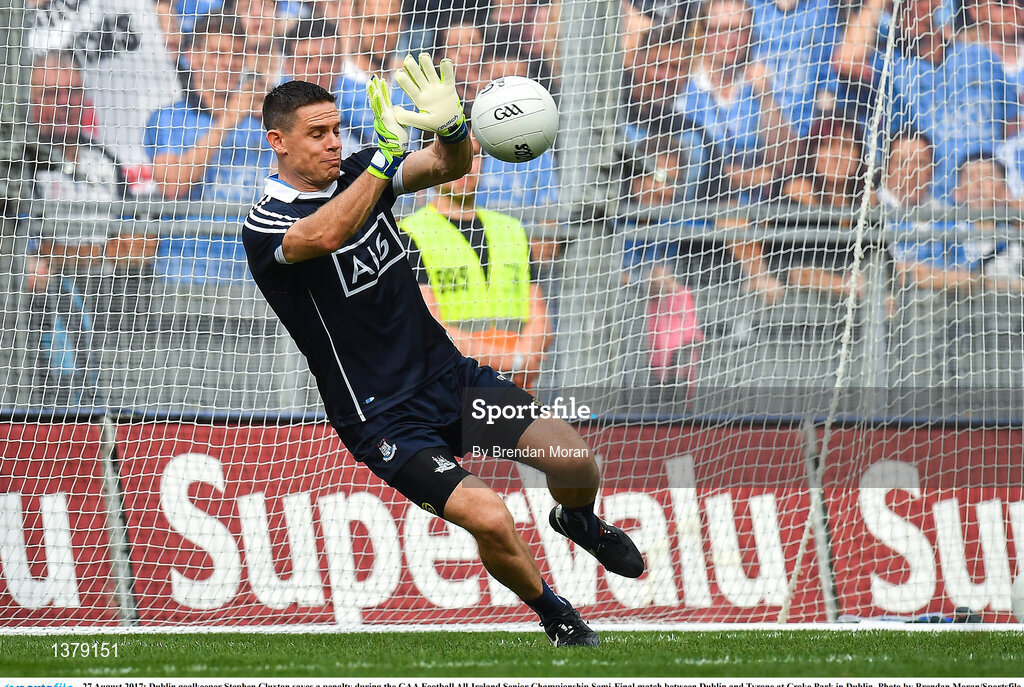 27 August 2017; Dublin goalkeeper Stephen Cluxton saves a penalty during the GAA Football All-Ireland Senior Championship Semi-Final match between Dublin and Tyrone at Croke Park in Dublin. Photo by Brendan Moran/Sportsfile