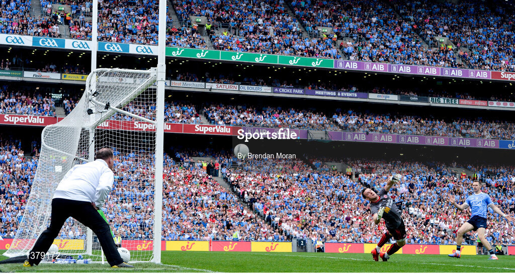27 August 2017; Tyrone goalkeeper Niall Morgan fails to stop a shot by Con O'Callaghan of Dublin (not in picture) for Dublin's first goal during the GAA Football All-Ireland Senior Championship Semi-Final match between Dublin and Tyrone at Croke Park in Dublin. Photo by Brendan Moran/Sportsfile