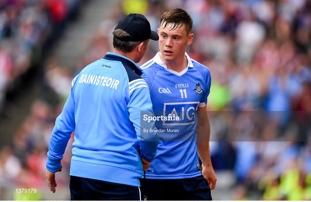 27 August 2017; Dublin manager Jim Gavin with Con O'Callaghan of Dublin after he was substituted late on during the GAA Football All-Ireland Senior Championship Semi-Final match between Dublin and Tyrone at Croke Park in Dublin. Photo by Brendan Moran/Sportsfile
