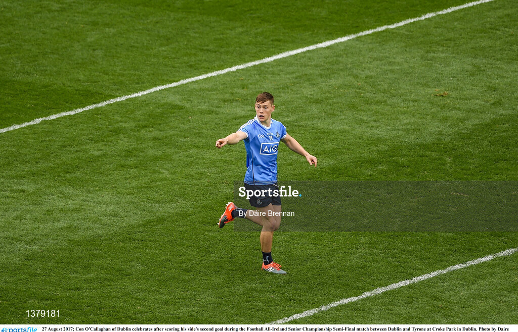 27 August 2017; Con O'Callaghan of Dublin celebrates after scoring his side's second goal during the Football All-Ireland Senior Championship Semi-Final match between Dublin and Tyrone at Croke Park in Dublin. Photo by Daire Brennan/Sportsfile