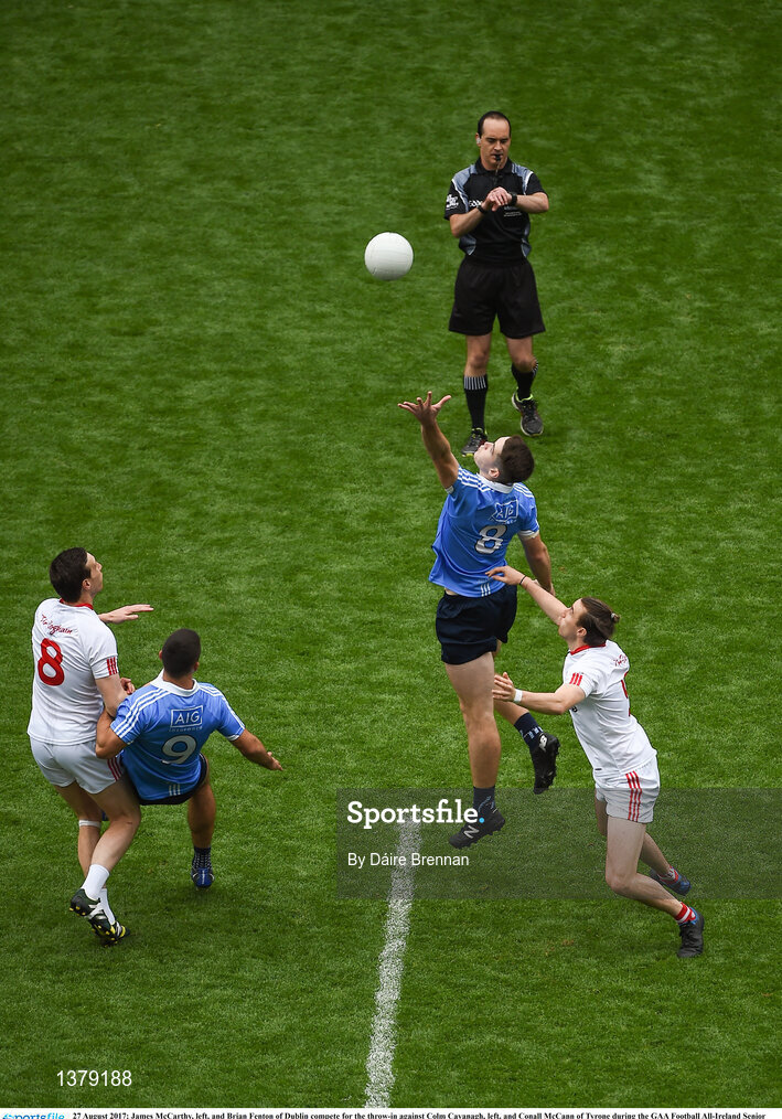 27 August 2017; James McCarthy, left, and Brian Fenton of Dublin compete for the throw-in against Colm Cavanagh, left, and Conall McCann of Tyrone during the GAA Football All-Ireland Senior Championship Semi-Final match between Dublin and Tyrone at Croke Park in Dublin. Photo by Daire Brennan/Sportsfile