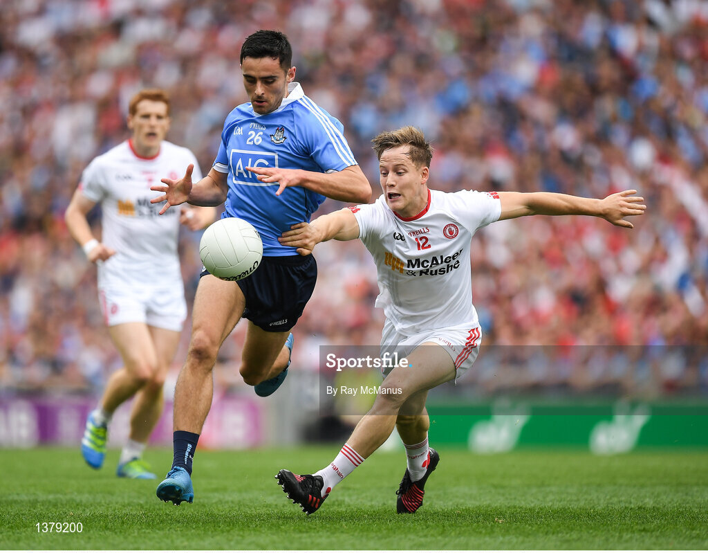 27 August 2017; Niall Scully of Dublin in action against Kieran McGeary of Tyrone during the GAA Football All-Ireland Senior Championship Semi-Final match between Dublin and Tyrone at Croke Park in Dublin. Photo by Ray McManus/Sportsfile