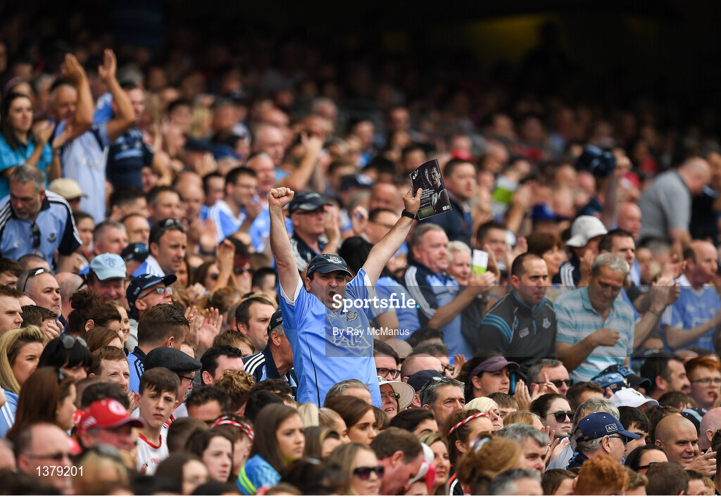 27 August 2017; Dublin supporters in the Cusack Stand celebrate an early score during the GAA Football All-Ireland Senior Championship Semi-Final match between Dublin and Tyrone at Croke Park in Dublin. Photo by Ray McManus/Sportsfile