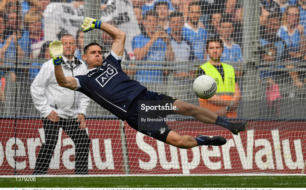 27 August 2017; Dublin goalkeeper Stephen Cluxton saves a penalty during the GAA Football All-Ireland Senior Championship Semi-Final match between Dublin and Tyrone at Croke Park in Dublin. Photo by Brendan Moran/Sportsfile