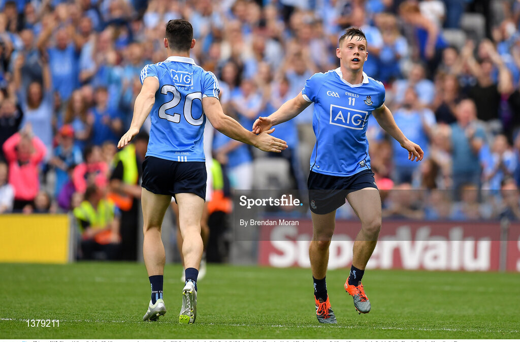 27 August 2017; Diarmuid Connolly, left, of Dublin runs on to replace team-mate Con O'Callaghan during the GAA Football All-Ireland Senior Championship Semi-Final match between Dublin and Tyrone at Croke Park in Dublin. Photo by Brendan Moran/Sportsfile