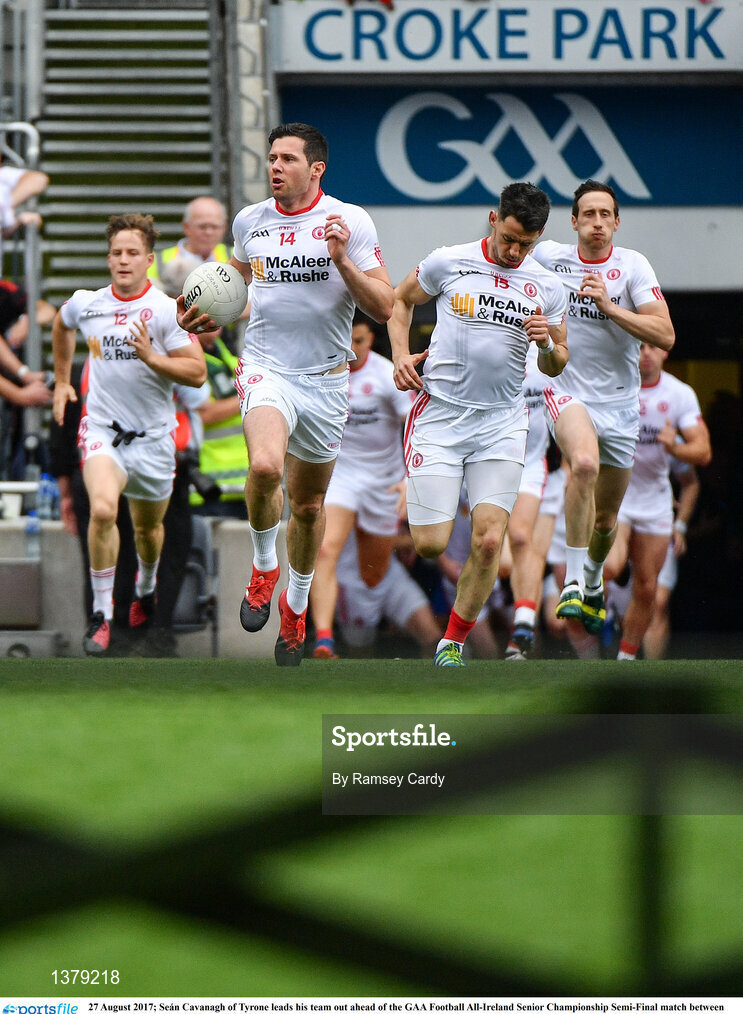27 August 2017; Seán Cavanagh of Tyrone leads his team out ahead of the GAA Football All-Ireland Senior Championship Semi-Final match between Dublin and Tyrone at Croke Park in Dublin. Photo by Ramsey Cardy/Sportsfile