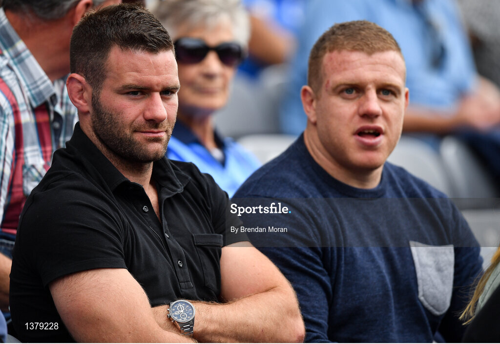 27 August 2017; Leinster and Ireland rugby players Fergus McFadden, left, and Sean Cronin in the crowd during the GAA Football All-Ireland Senior Championship Semi-Final match between Dublin and Tyrone at Croke Park in Dublin. Photo by Brendan Moran/Sportsfile